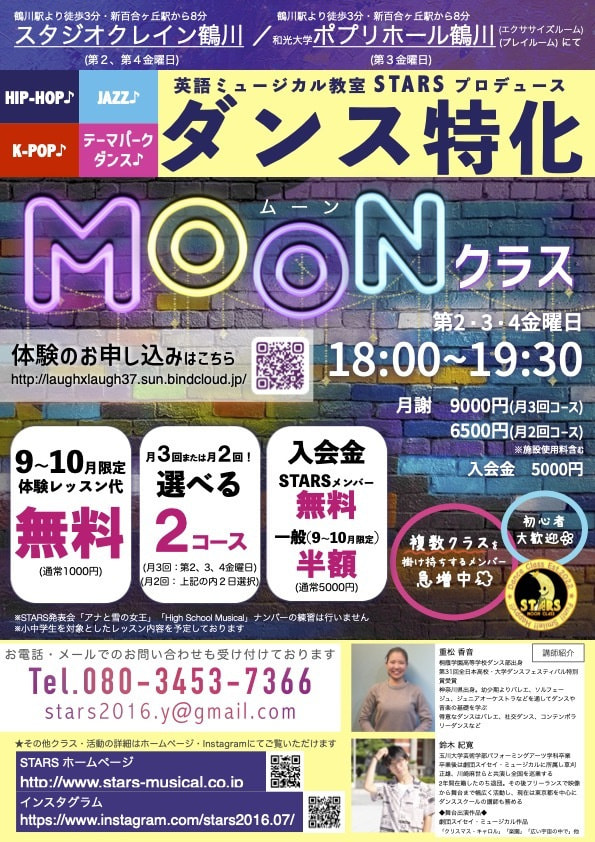 初めて、ダンス教室のドアをノックするまでの緊張感。私達も、あの時の感覚を今でも覚えています。ご安心ください。MOONは、とってもアットホームですし、ダンス初心者の方へのフォローもしっかりさせていただきます!ダンスが踊れるようになる楽しさを知ってもらうのが一番嬉しく思います。