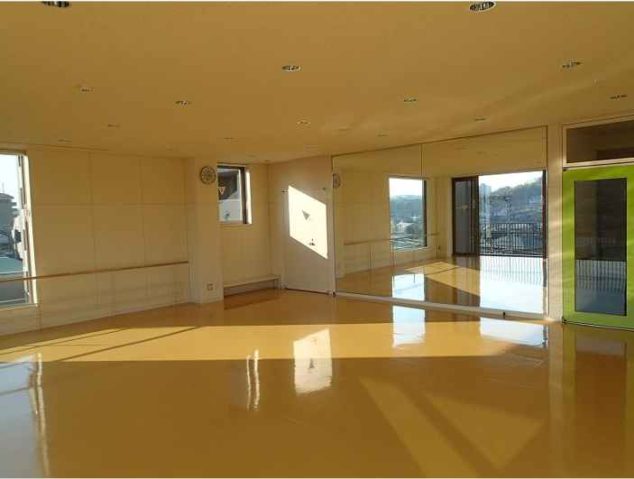 特殊な設計をされたスタジオで、天井が高く開放感があります。下は、木の床になっていてアットホームな空間を演出しています。ダンス仕様の鏡もあるので、ストレッチや体操の動きを確認できます。
